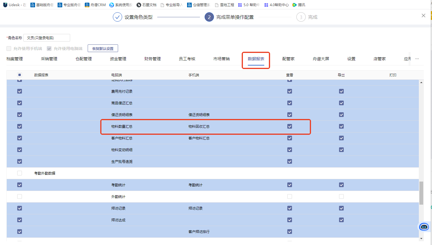 需在档案管理-角色权限配置-找到对应角色编辑-数据报表-物料数量汇总的勾选查看权限。