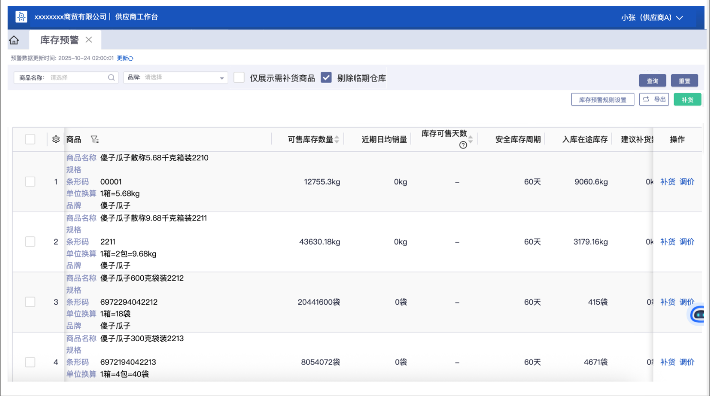 供应商账号登录后,可以查看库存预警表并基于库存预警表自主补货。库存预警表和管家库存预警表趋同,但做以下处理: