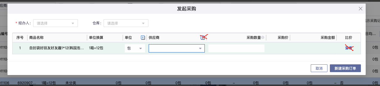 2.做采购订单时默认当前供应商以及当前操作人(两者均不可选)