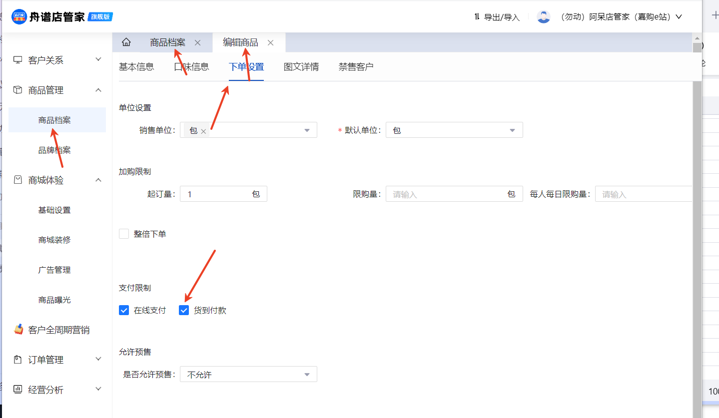 需在店管家-商品档案-下单设置勾选货到付款的支付方式。