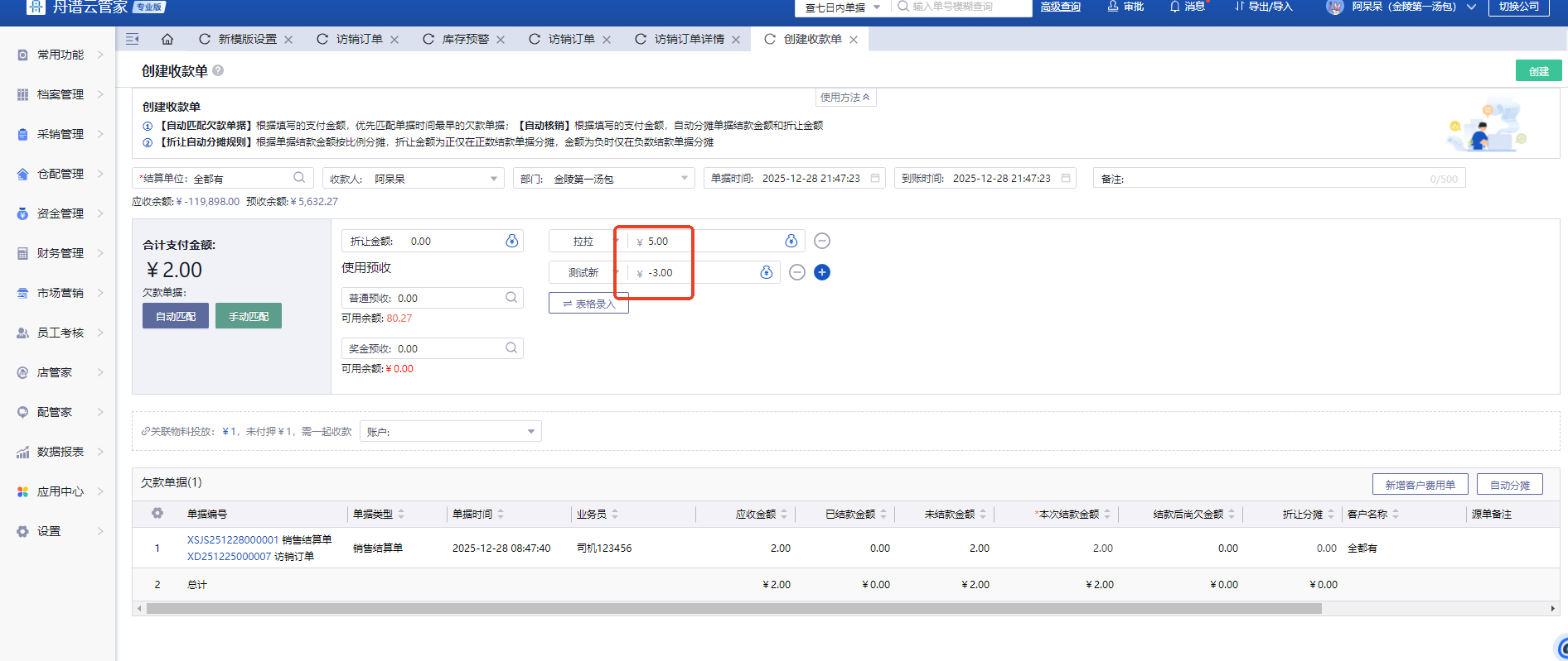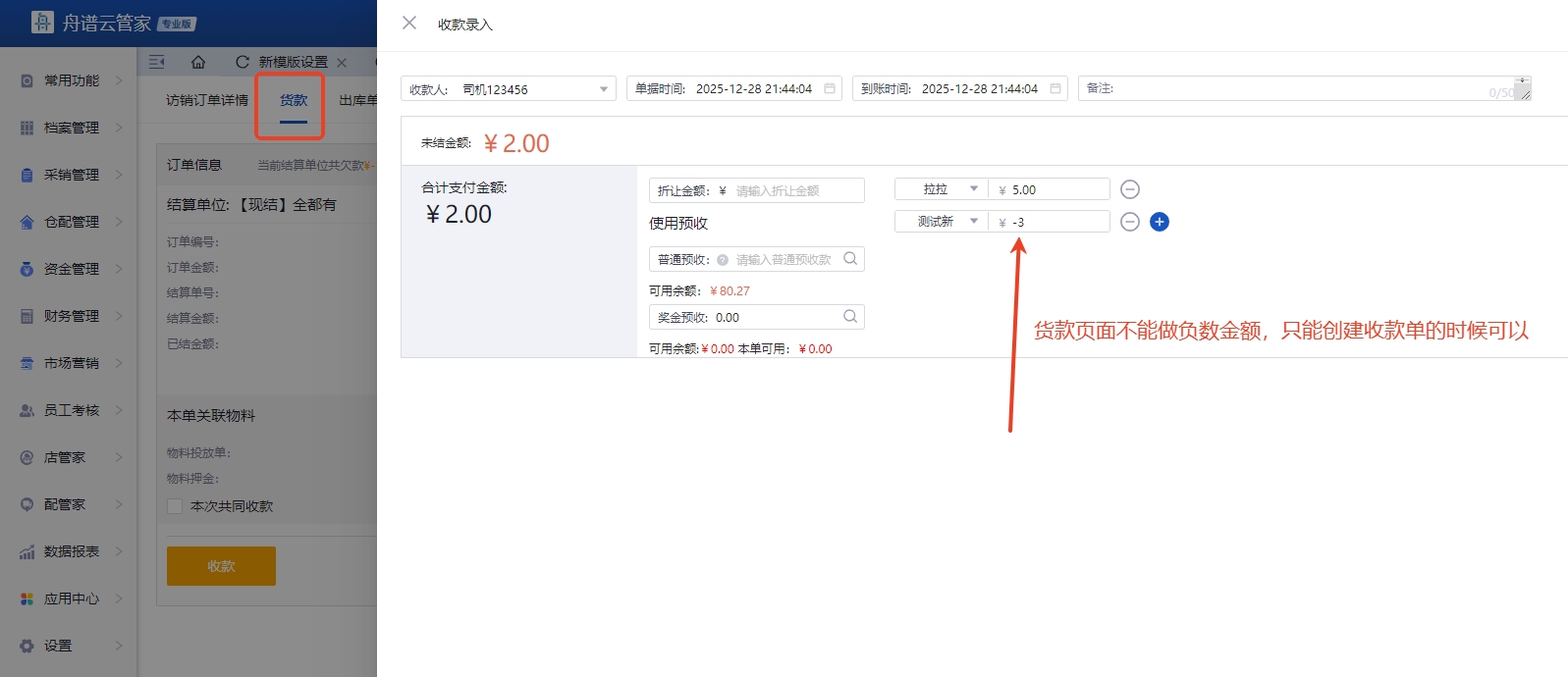 是的,目前只有创建收款单的时候账户可以输入负数。比如未结款2元,微信收5元,现金-3元。