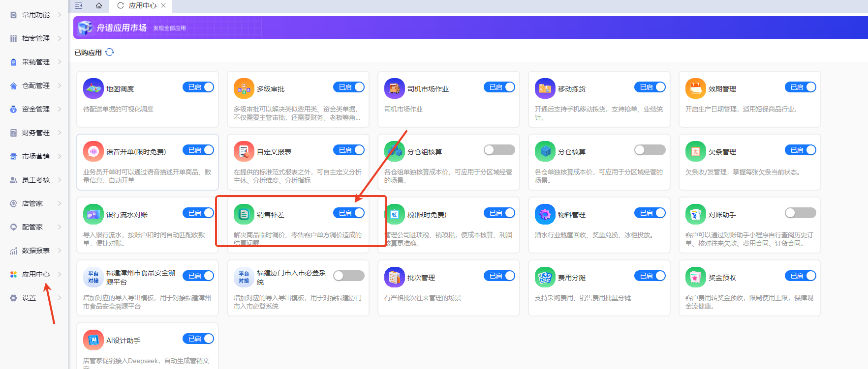 需要在应用中心开启销售补差这个应用。