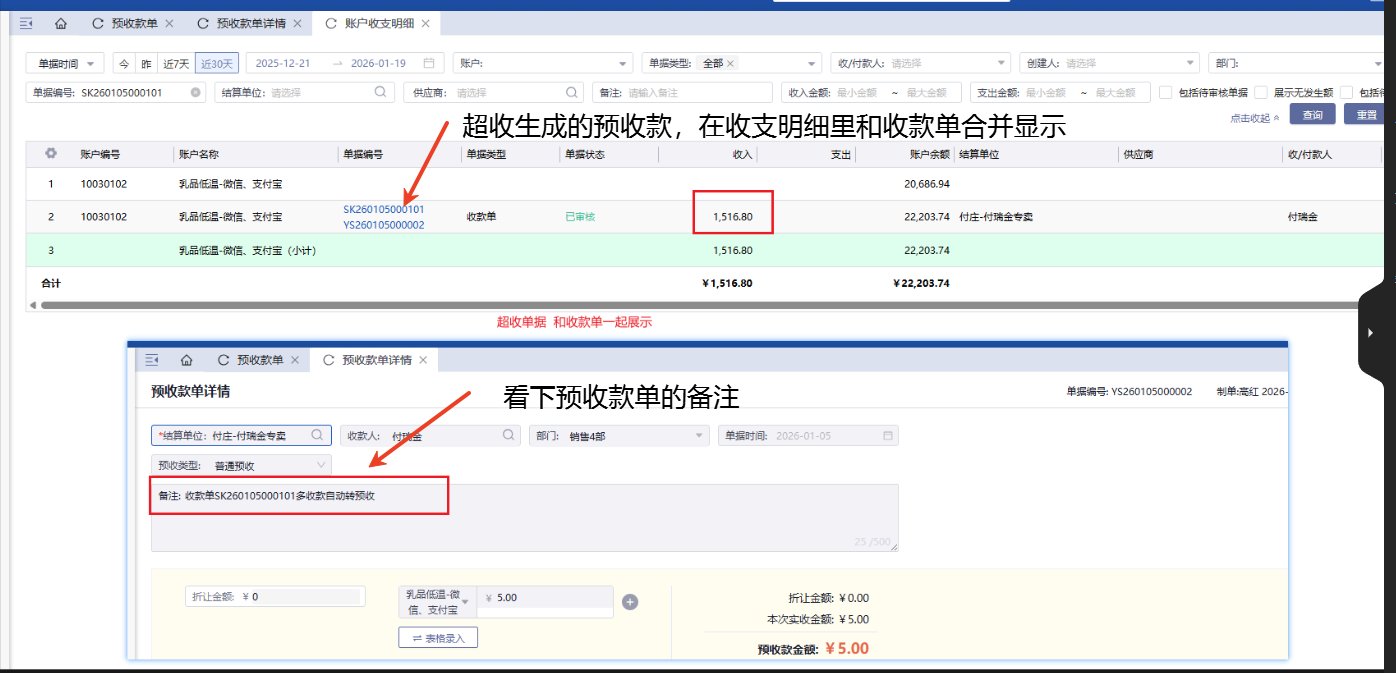 检查该预收款是否为收款时的超收金额生成,如果是的话是的话,在账户收支明细表里和收款单一起展示。
