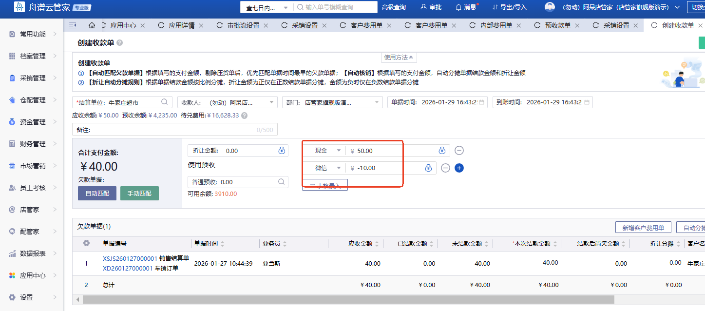 收款单可以多收客户的款吗?比如单据金额40,收了客户50的现金,转10元给客户微信