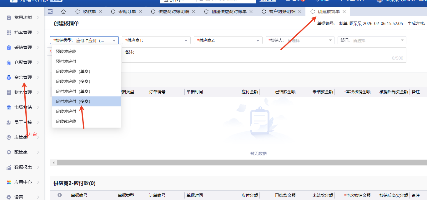 可以。资金管理-核销单创建时,选择应付冲应付(多商),即可冲减不同供应商之间的欠款。