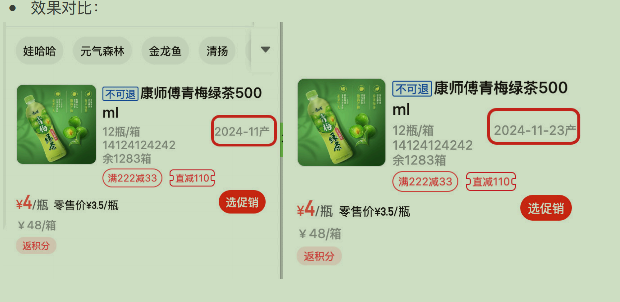当前可选择展示商品可售库存最老/最新生产日期或生产月份。