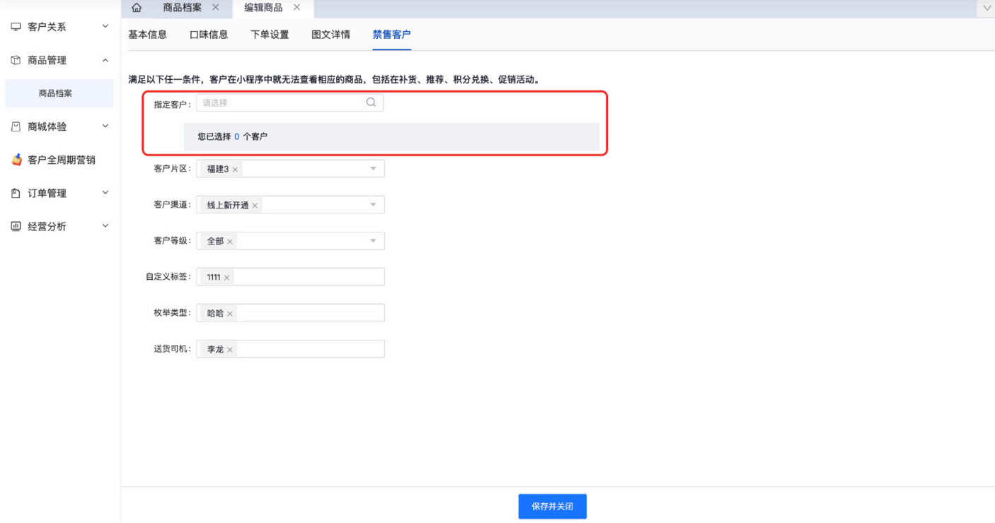 档案管理-商品档案,选择禁售的客户