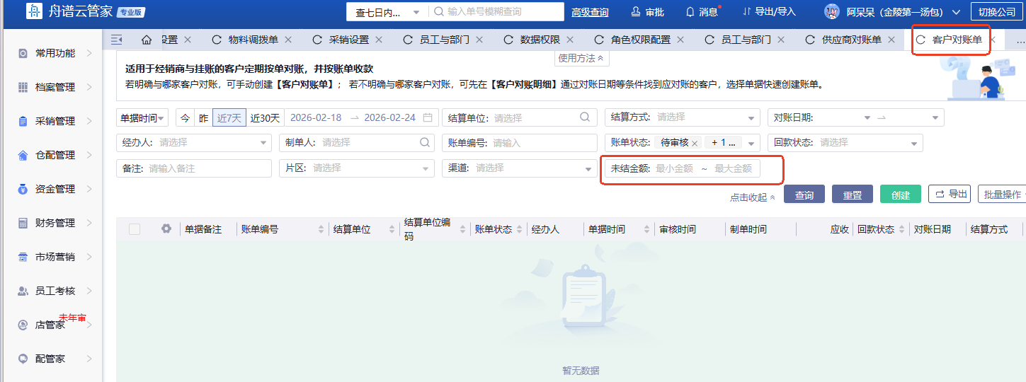 可以按对账单的未结金额筛选。