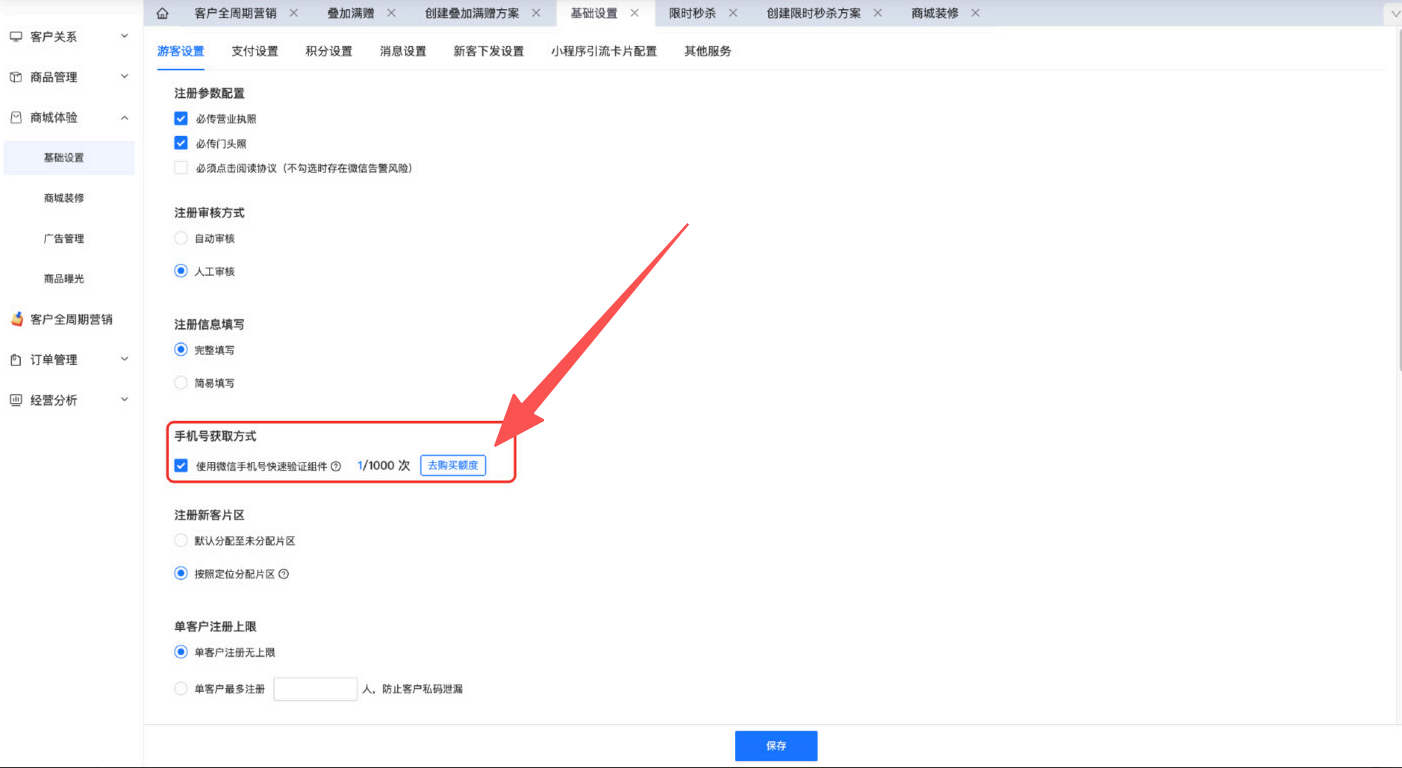 注意:当开启后,每个小程序账号将有1000次体验额度,需要经销商提前自行前往购买小程 序付费能力,防止额度耗尽导致功能失效。若额度耗尽,游客注册时只能通过手动填写手机号。