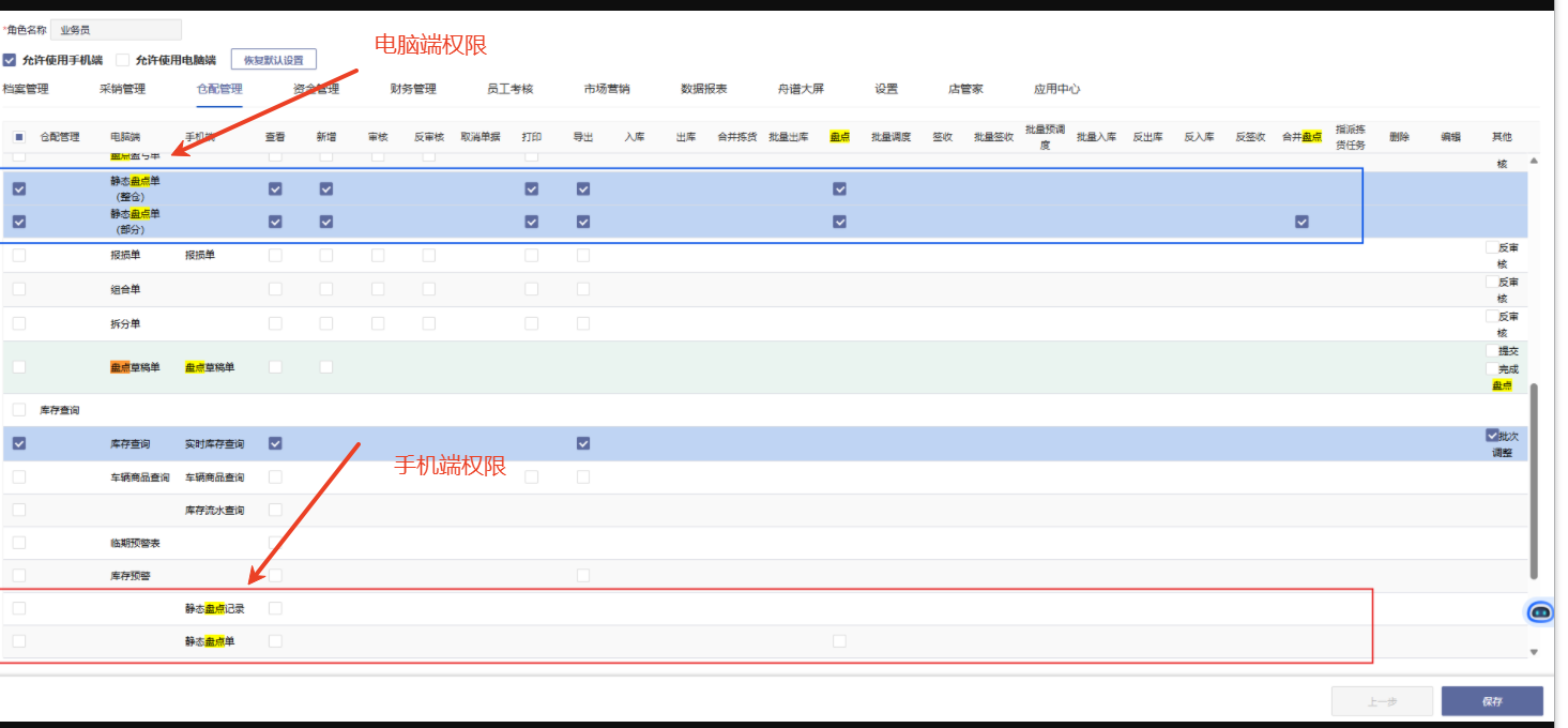 注意:手机端的权限和电脑端是分开设置的,上方是电脑单,下滑到底是手机端。