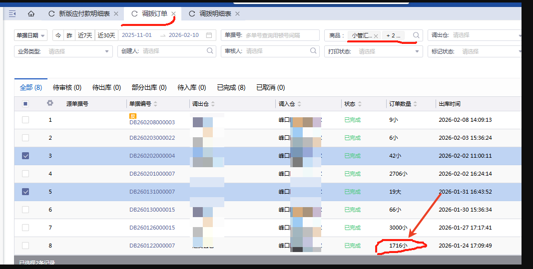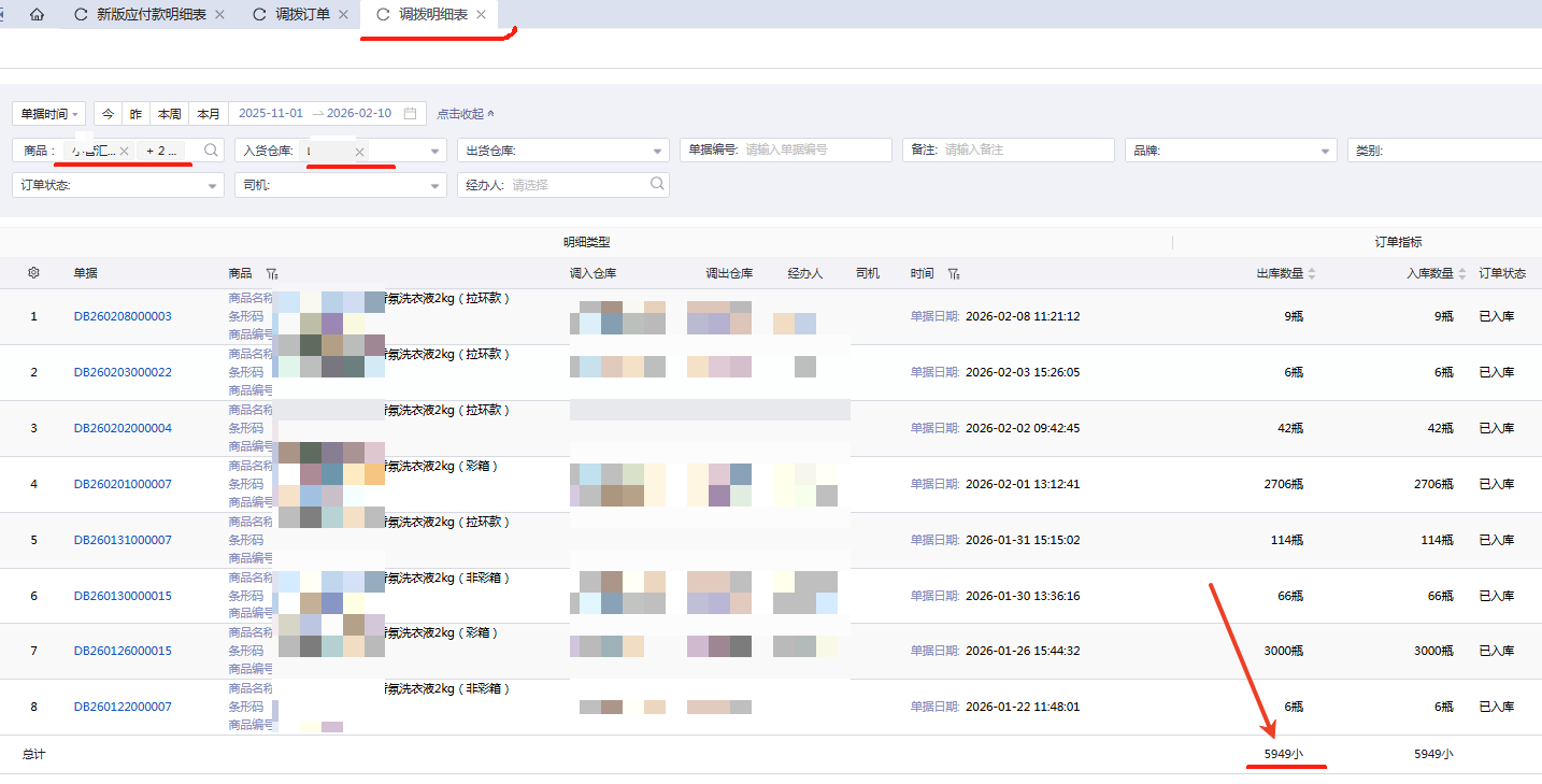 如果要看商品合计,建议通过调拨订单汇总表汇总调拨明细表统计。