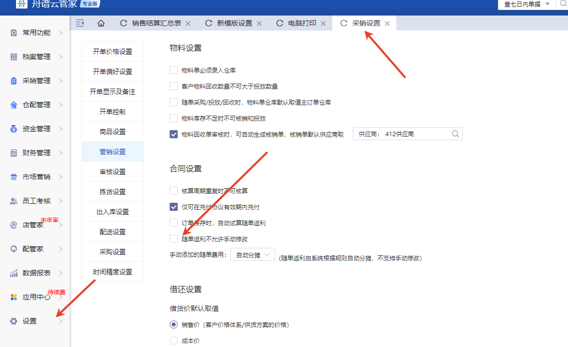 检查下设置-采销设置-营销设置-随单返利是否允许手动修改