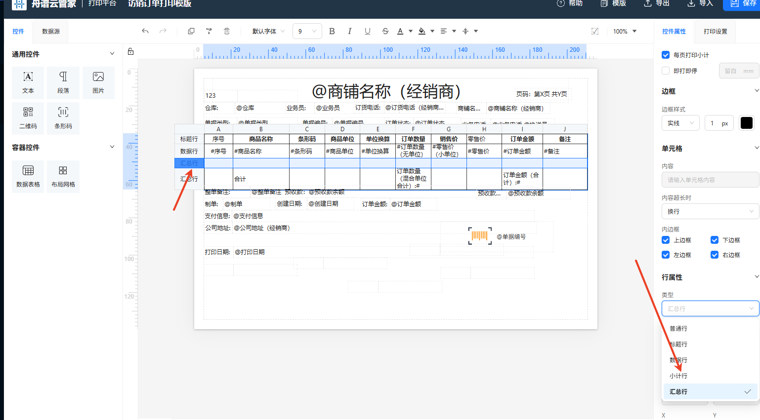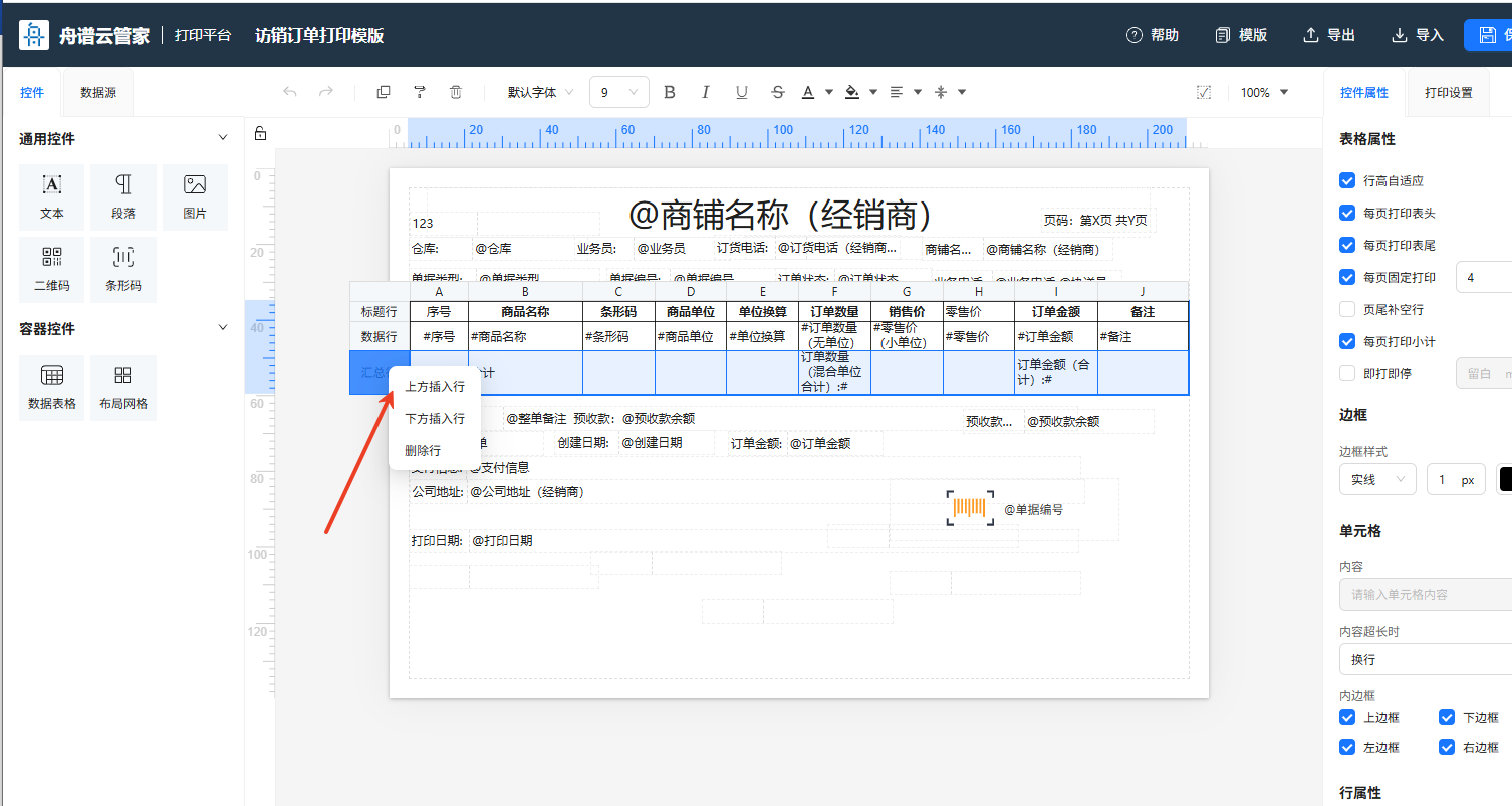 新版打印模板怎么插入小计行?