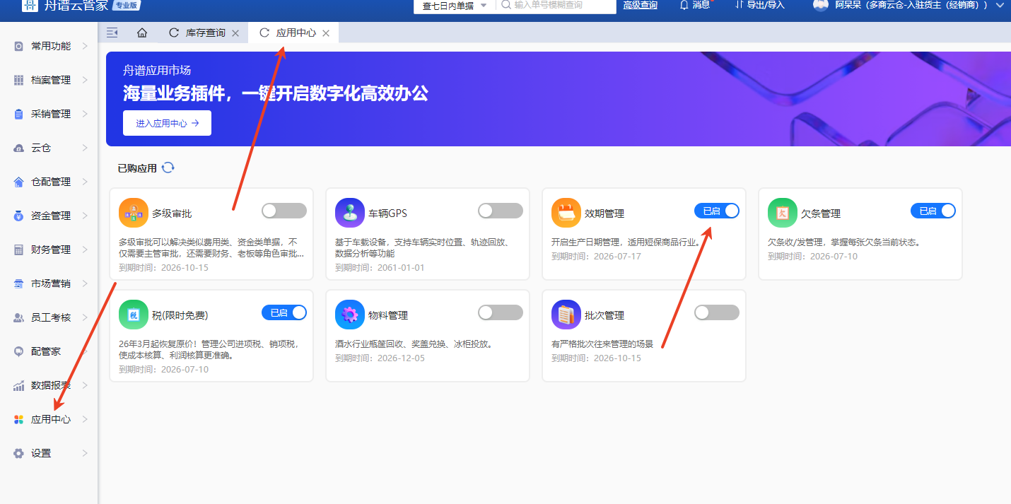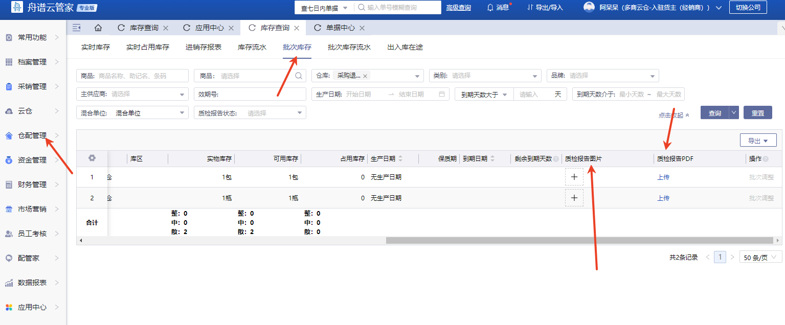需先在应用中心-订阅效期管理,订阅后刷新系统打开仓配管理-库存查询报表-点开批次管理页面进行上传和查询,可在访销订单-出库单-导出质检报告。