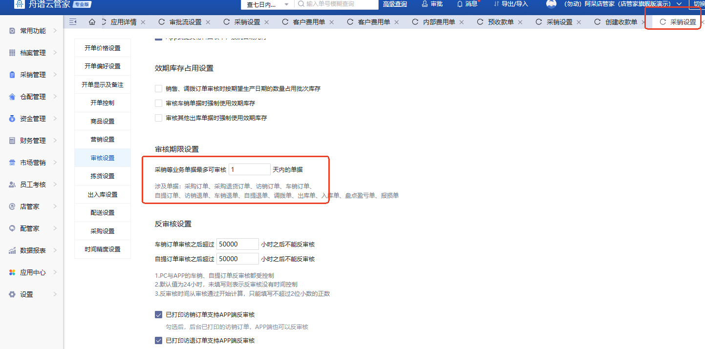 支持。在设置-采销设置-审核设置里配置天数,但是访销订单的出库和签收时间最多只能180天内,请谨慎处理。