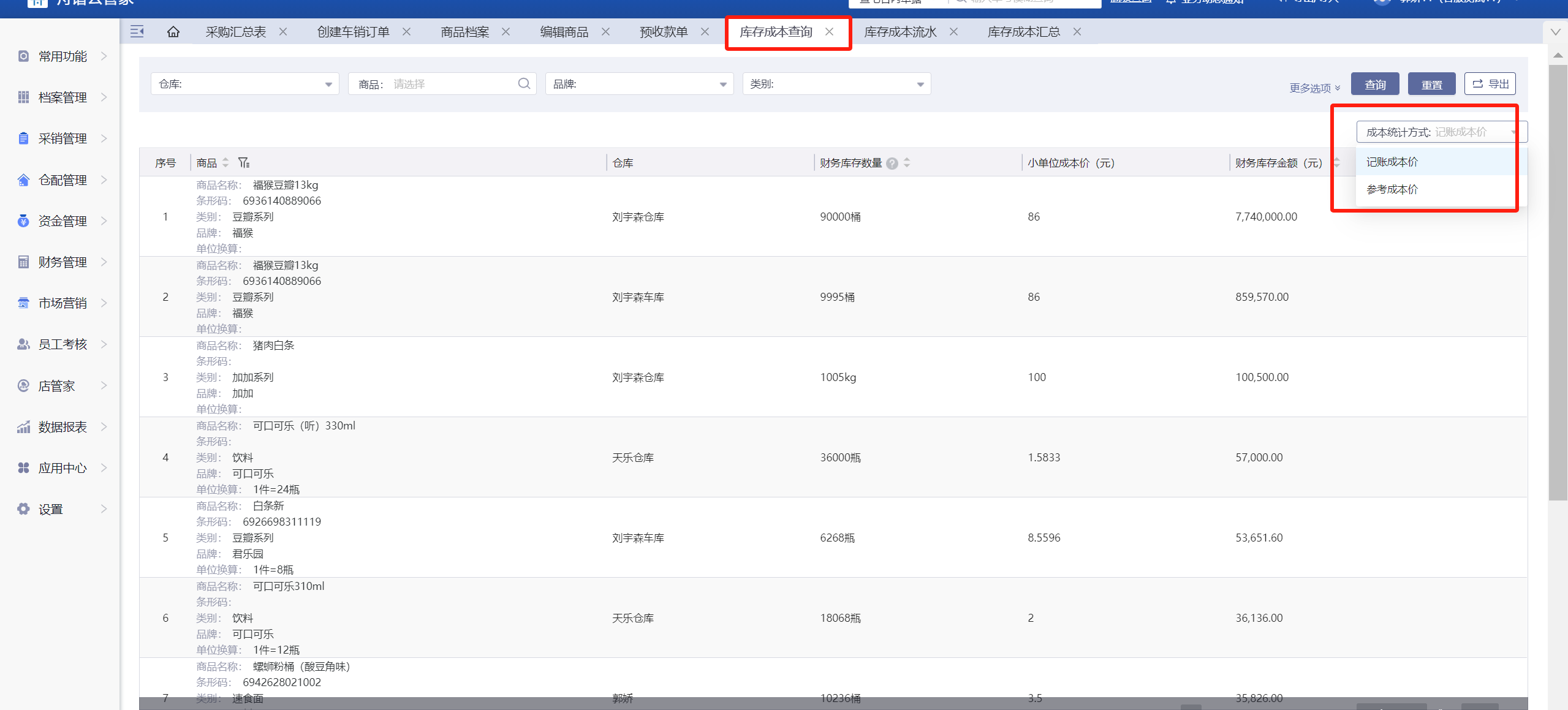 1、库存成本查询页面成本统计方式可以选择记账成本价或者参考成本价;