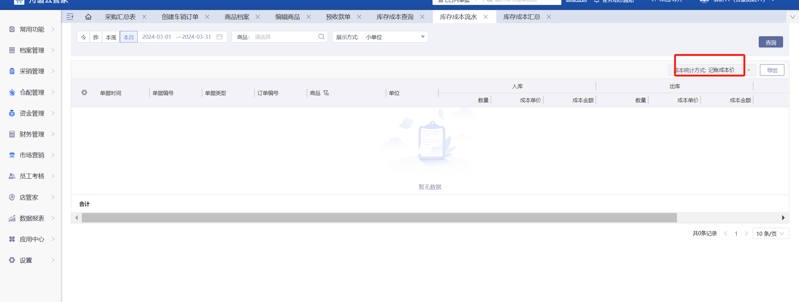 2、成本库存汇总和成本库存流水页面成本统计方式为记账成本价。