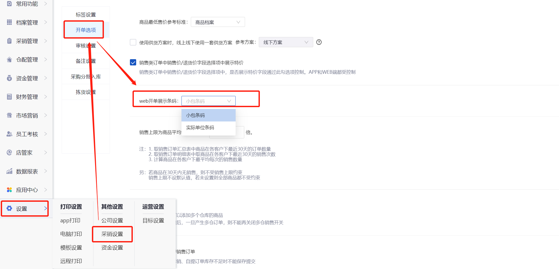1、开单页面展示的条码,您可以在设置-采销设置-检查web开单展示条码的设置。如果设置的展示是小包条码,商品档案只填写了小单位条形码的情况下,开单时即使开的是大单位,开单页面也会展示出小单位的条形码;