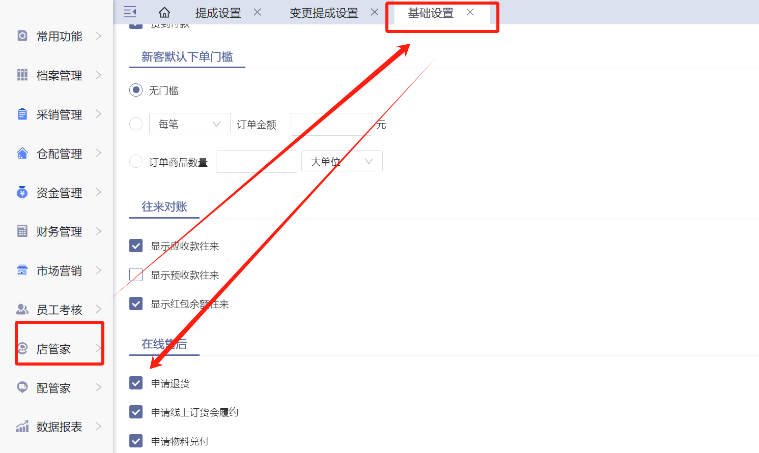 2、店管家客户收到货后需要退货:可以在店管家小程序我的--在线客服--申请退货,后台生成访销退单,保存审核会自动生成一张审核的金额是负数的收款单,入库单入库审核。